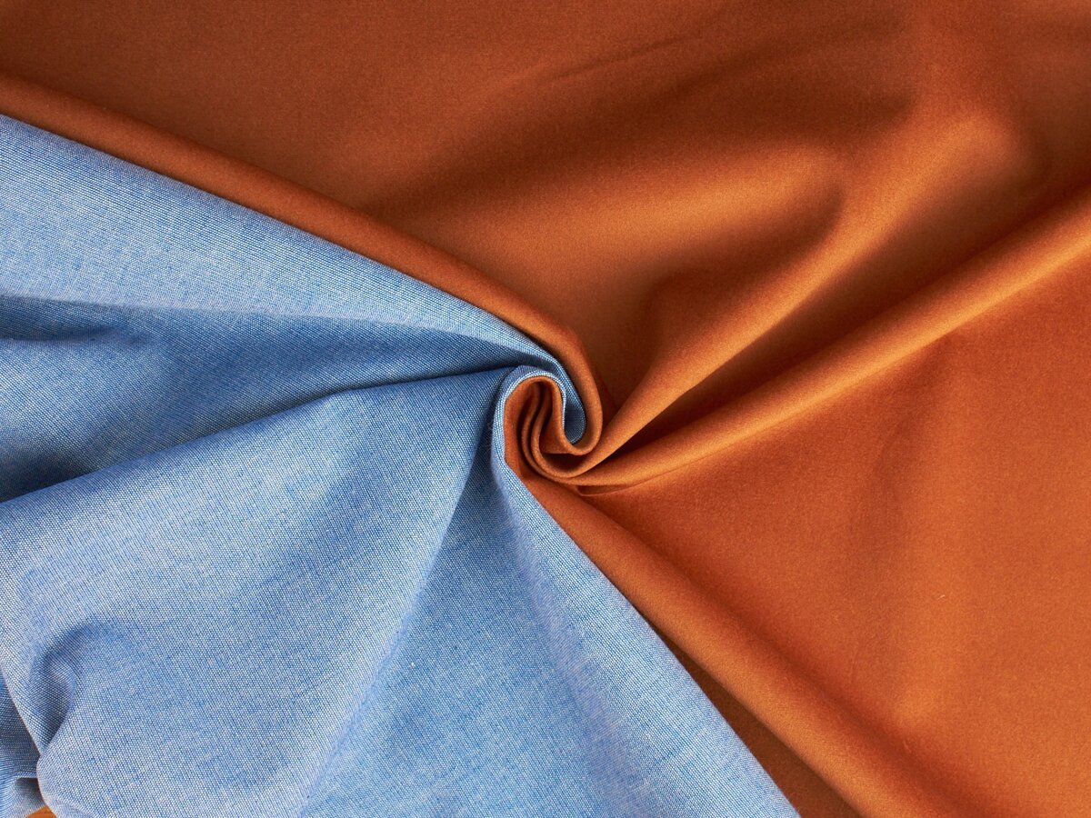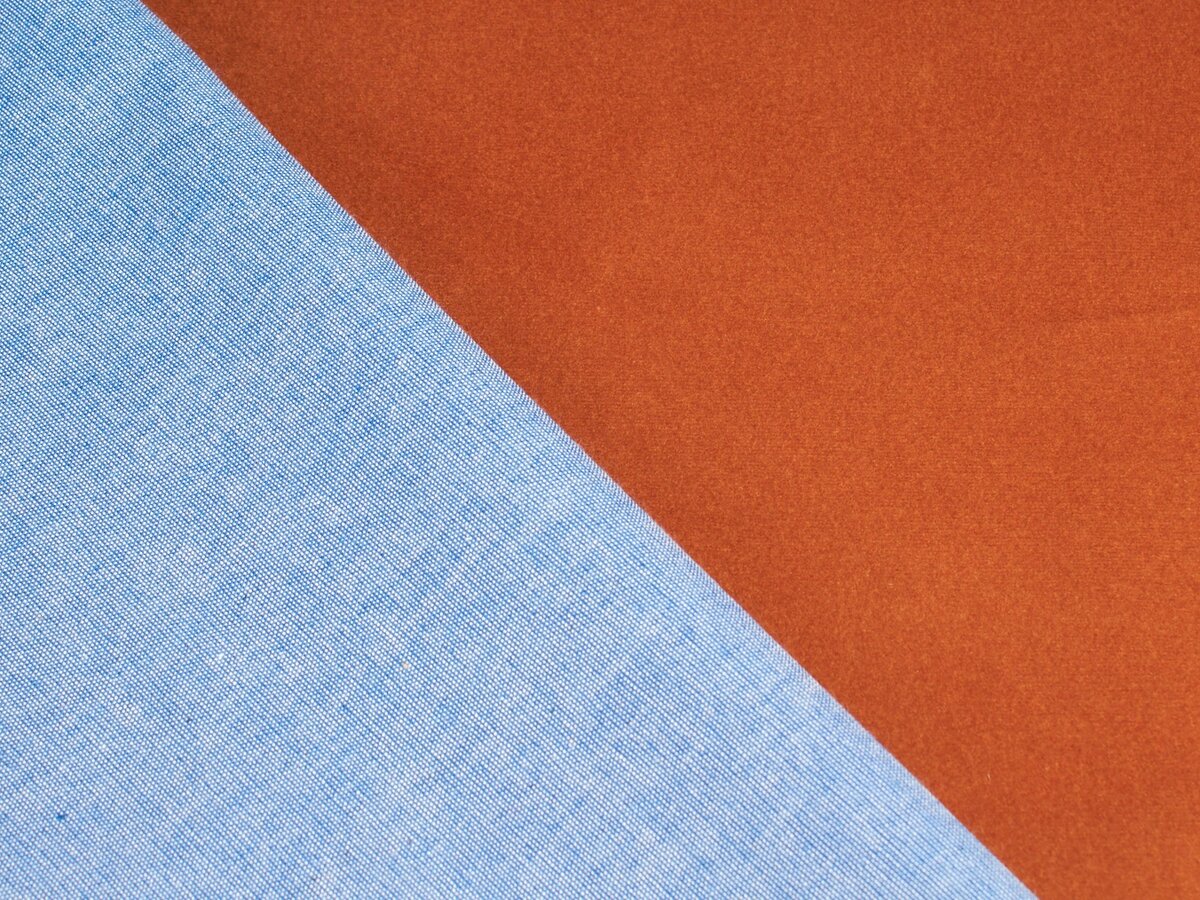 Гениално съчетание на класически синьо дънково платно с класически набук в руден махагонов оттенък. Цялото е изработено от памук, набукът е кадифен на допир, прекрасно имитира истинска кожа. Тъканта е лека, но здрава и много добре седи и работи. Тъканта е двустранна, което ѝ дава много възможности в стилизациите.
