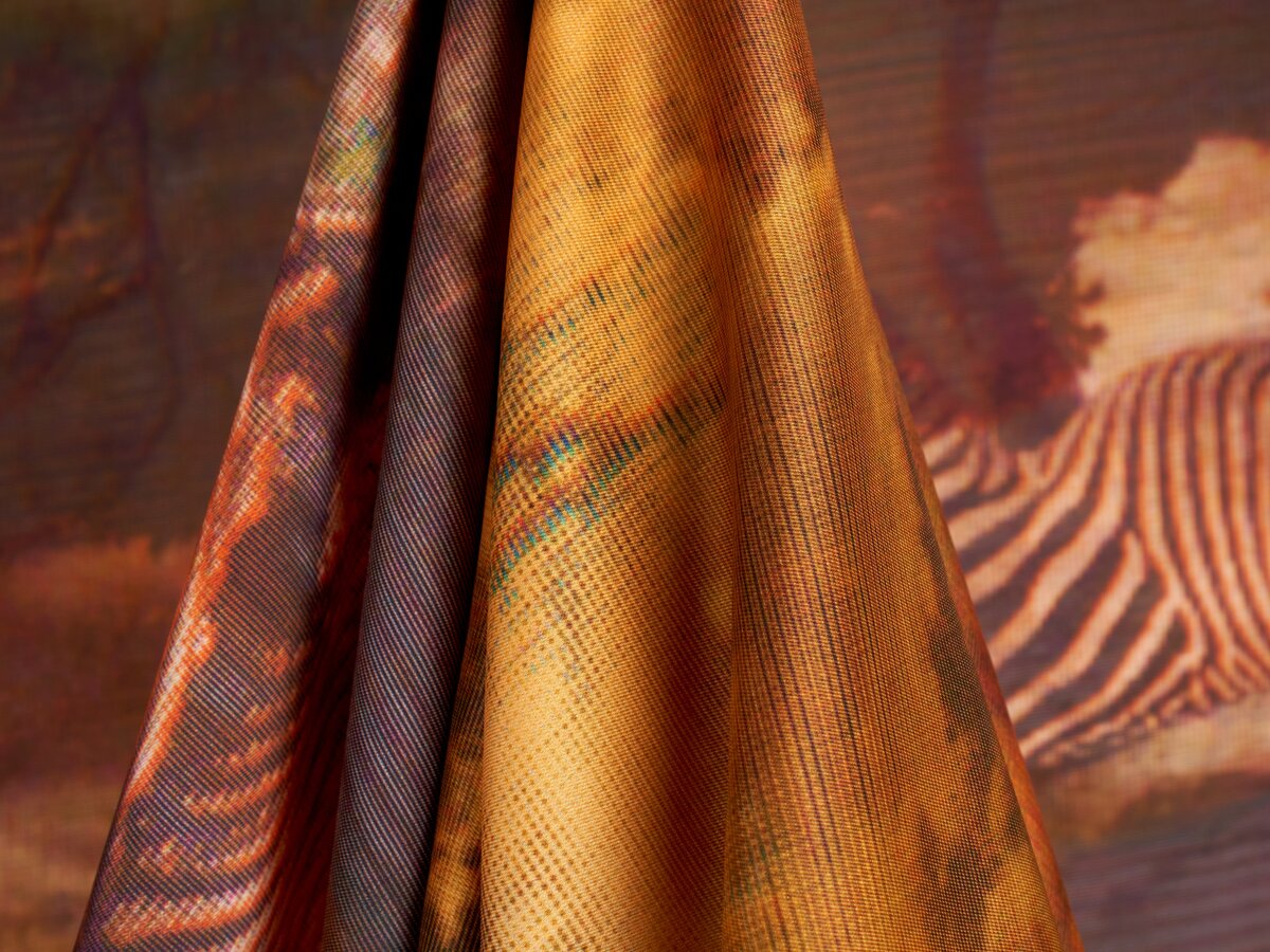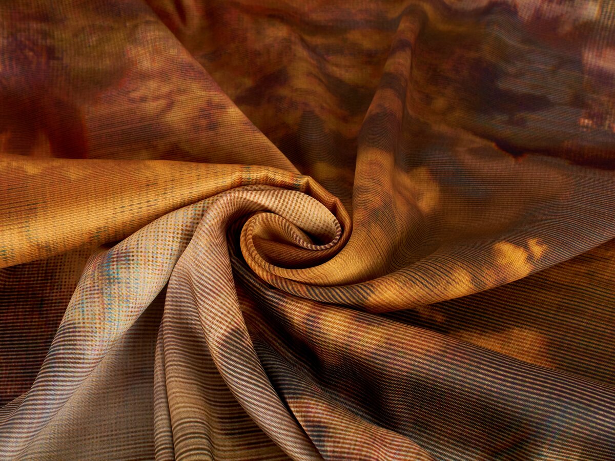 Vzor podzimního safari na lehké saténové látce s polomatným povrchem. Lehké, splývavé a neprůhledné. Barvy od hnědé, rezavé, zlaté až po popelovou a zelenou. Doporučujeme na šaty, tuniky, sukně.