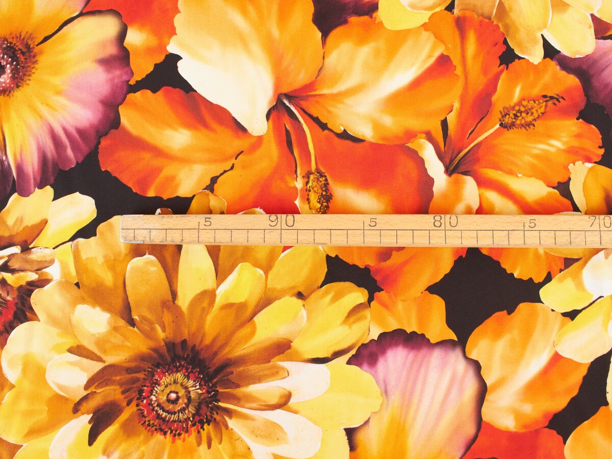 Vi anbefaler en mat silke, med behagelig elastan. Højre - den rigtige del af silken er mat, venstre derimod er dækket med satin. Blomster over hele silken, stærke mættede farver. Silken er ikke gennemsigtig og kræver ikke foer. Den er utrolig behagelig at røre ved og falder smukt.