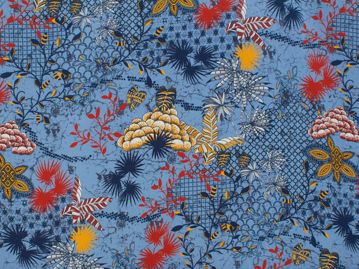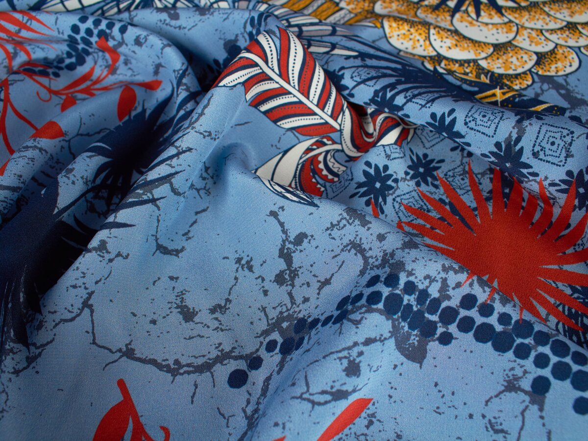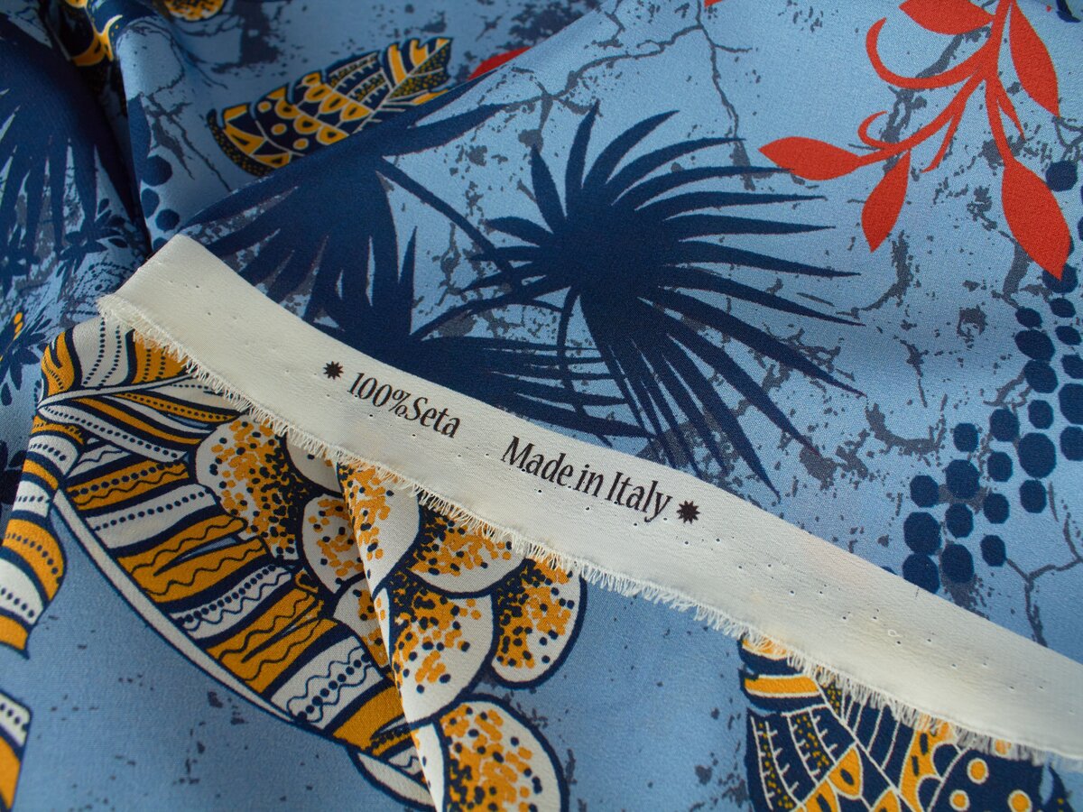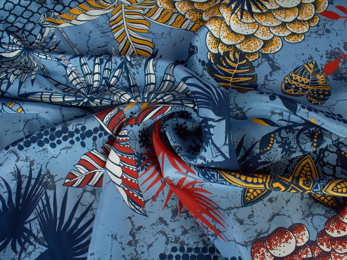 Vi præsenterer silke signeret i Dior-stil med et ekstravagant maritimt mønster med tropiske accenter. Stof er glat og mat at røre ved. Det har en meget subtil glans.