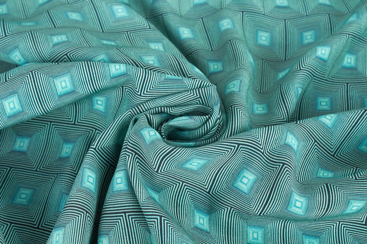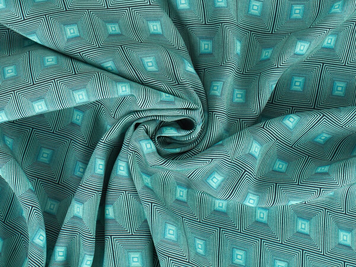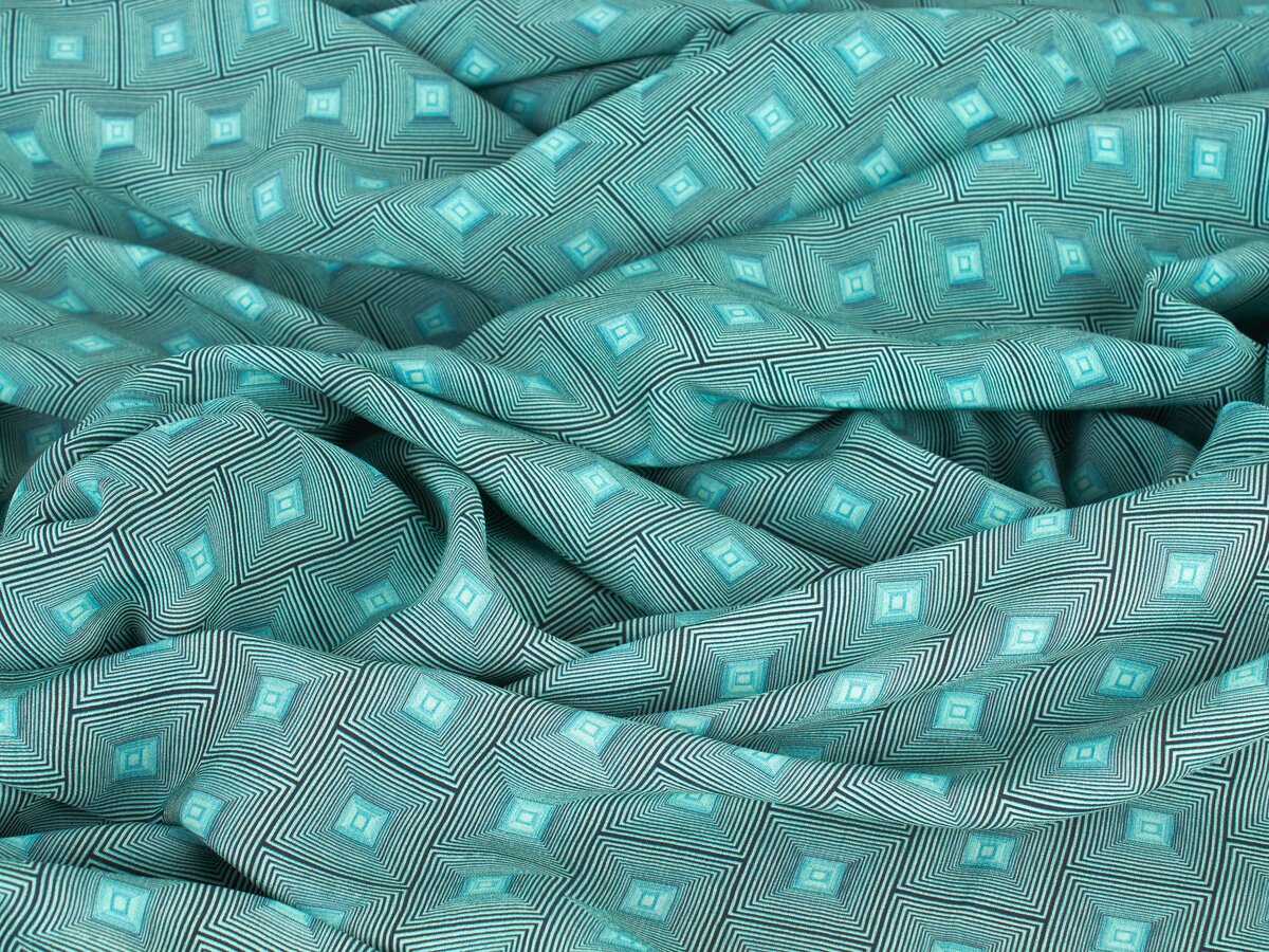 Ιταλικό όμορφο ρέον βισκόζ σε λεπτό τζορζέτ ύφανση. Δεν διαφανίζει, κάθεται υπέροχα. Έχει πολύ ενδιαφέρον μοτίβο από τουρκουάζ τετράγωνα μέσα σε τετράγωνα μέσα σε τετράγωνα, που δημιουργεί μια μαγευτική ψηφιδωτή εικόνα. Οι αποχρώσεις του τουρκουάζ και του ανοιχτού μέντας με μαύρο φόντο είναι ιδανικός συνδυασμός.