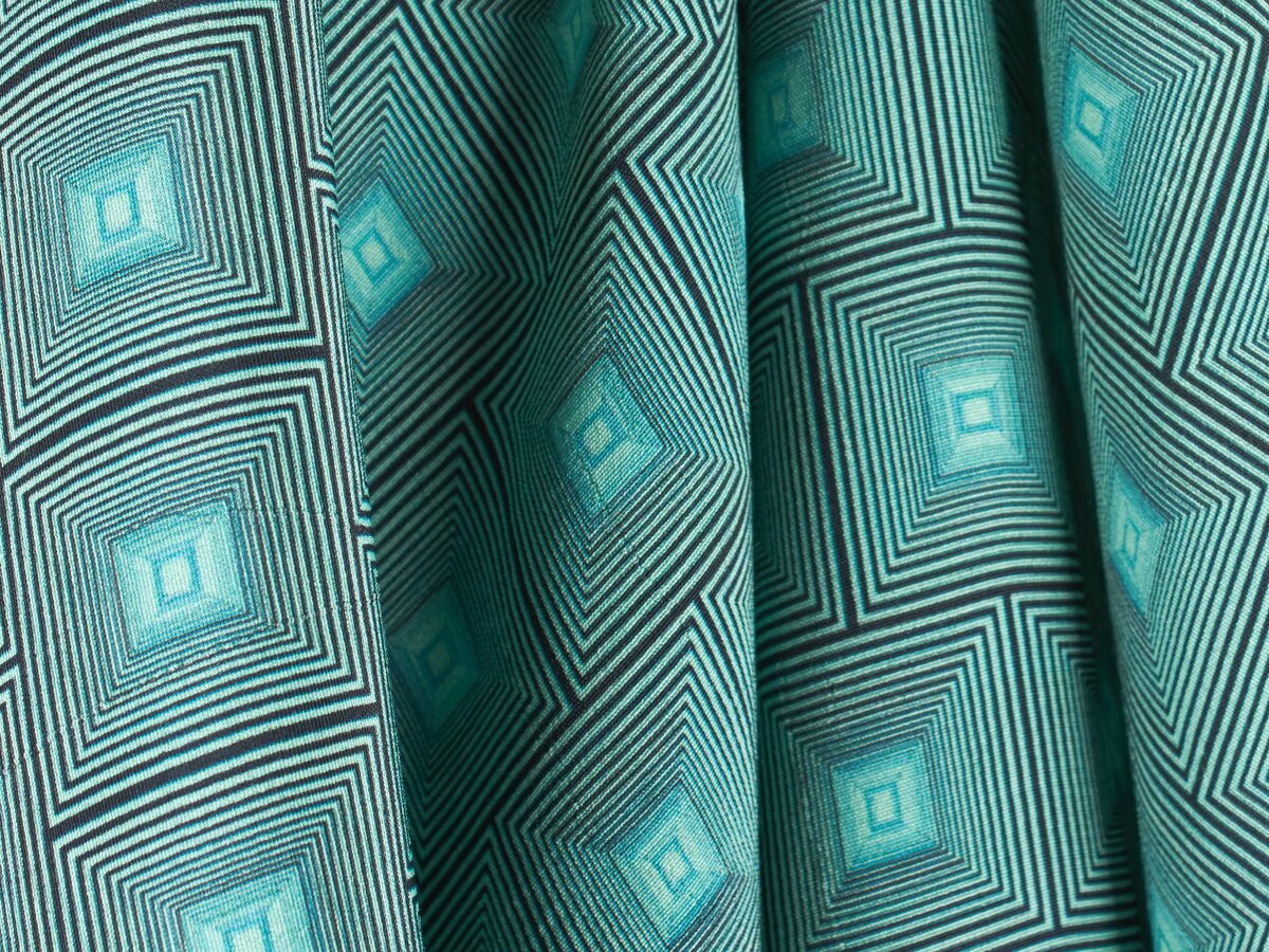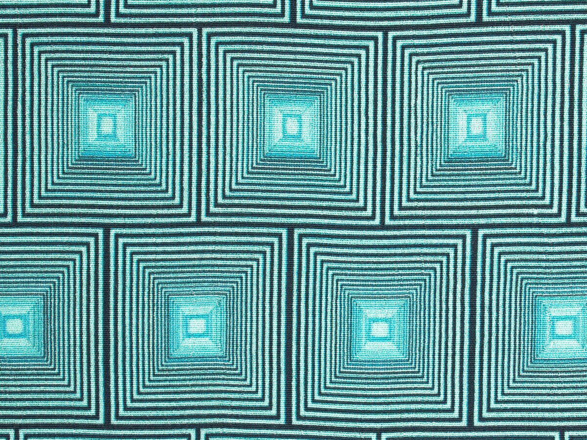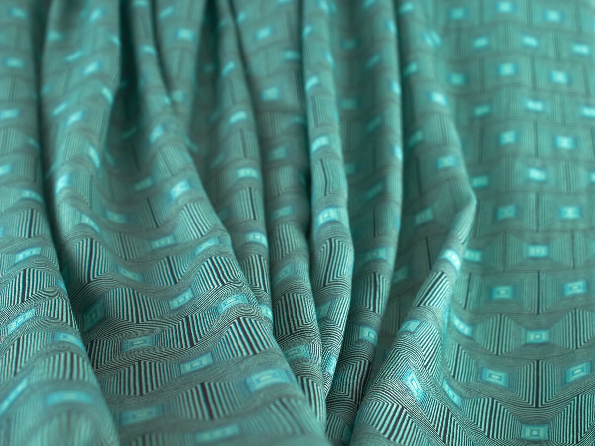 Ιταλικό όμορφο ρέον βισκόζ σε λεπτό τζορζέτ ύφανση. Δεν διαφανίζει, κάθεται υπέροχα. Έχει πολύ ενδιαφέρον μοτίβο από τουρκουάζ τετράγωνα μέσα σε τετράγωνα μέσα σε τετράγωνα, που δημιουργεί μια μαγευτική ψηφιδωτή εικόνα. Οι αποχρώσεις του τουρκουάζ και του ανοιχτού μέντας με μαύρο φόντο είναι ιδανικός συνδυασμός.