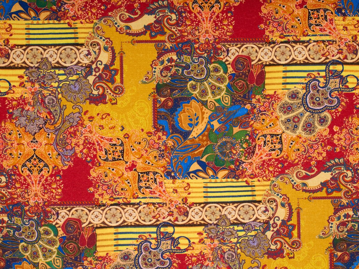 Ιταλική, φορεματική, υψηλής συστροφής μαλλί. Ανατολικός σχεδιασμός σε χρυσές, μελιτζανί αποχρώσεις που τονίζονται από έντονο κόκκινο, μπλε και πράσινο.