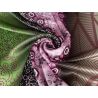 Esittelemme korkealaatuista silkkiä, joka on merkitty Italiasta. Kankaassa on erittäin epätavallinen kuosi, jossa on väriasteikko, paisley-kuvioita ja lehtiä. Silkki on valuvaa, pehmeää ja laskeutuu kauniisti, joten se soveltuu erinomaisesti kevyiden vaatteiden ompeluun. Se on satiinista, eikä se läpinäkyvä.