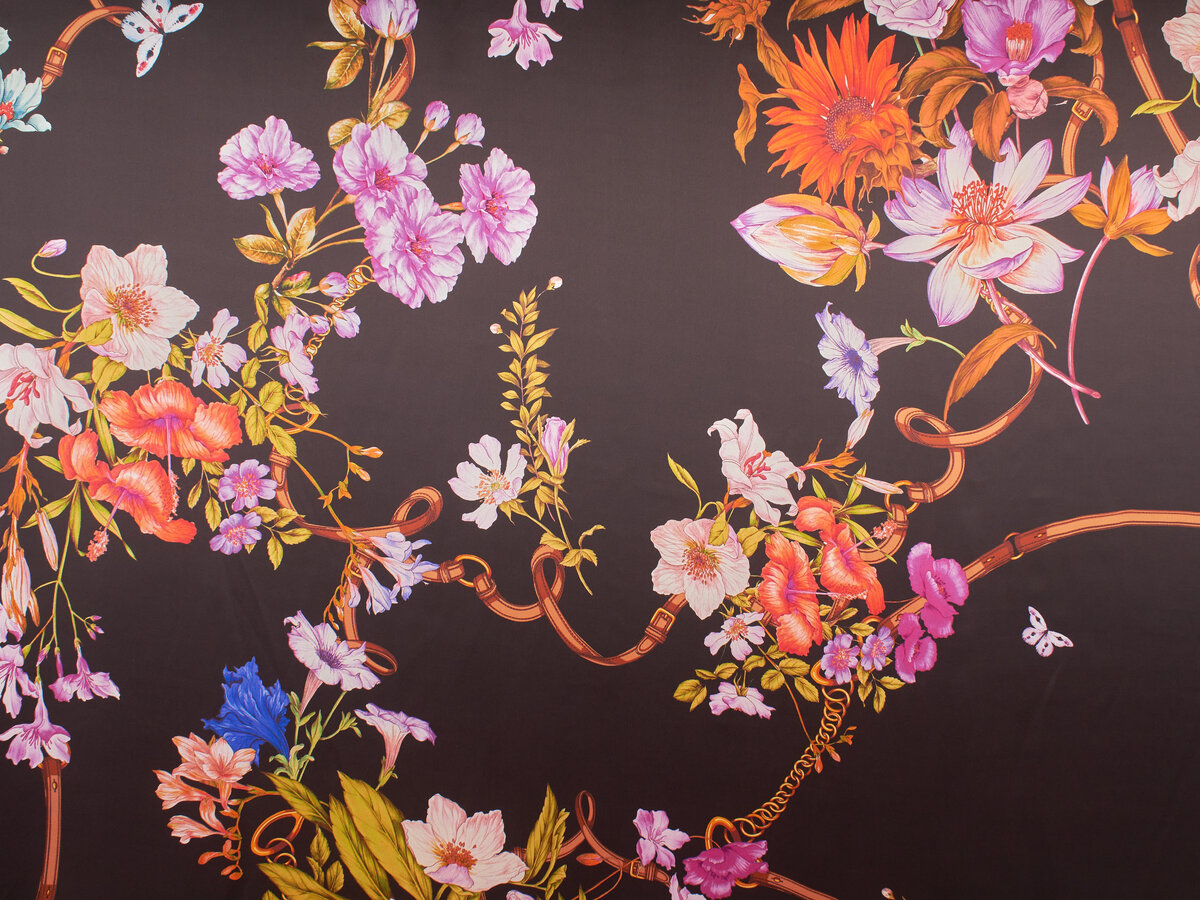 Esittelemme kauniilla kukkakuviolla varustetun silkki. Kankaassa on kevyt, laskeutuva, hienovaraisesti satiininen rakenne, joka sopii erinomaisesti mekkojen ja paitojen ompeluun. Se toimii myös hameena.