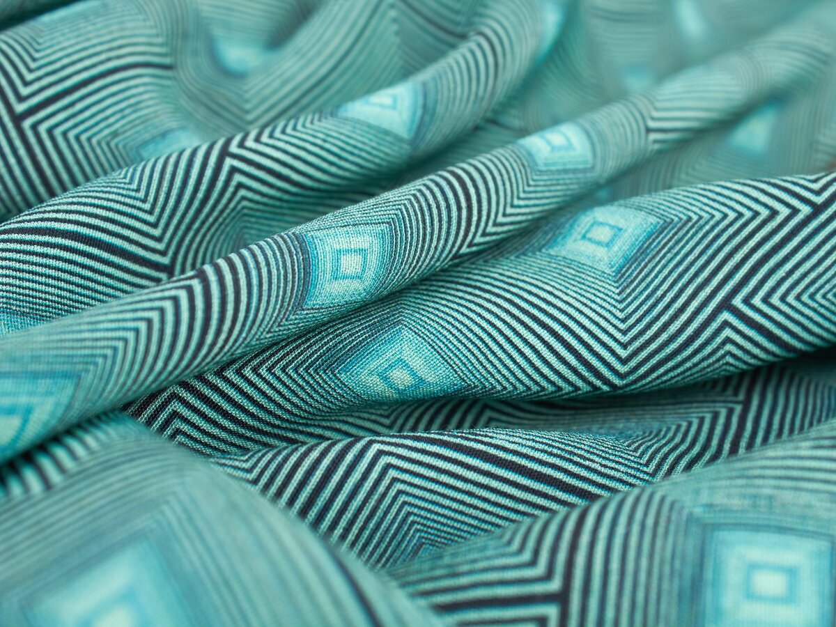Olasz gyönyörű, folyó viszkóz szövet, finoman zsorzsett mintázattal. Nem átlátszó, csodásan hullik. Nagyon érdekes türkiz négyzetek mintázata négyzetekben, ami figyelemfelkeltő mozaikot alkot. A türkiz és világos mentazöld árnyalatai fekete háttérrel tökéletes kombinációt alkotnak.