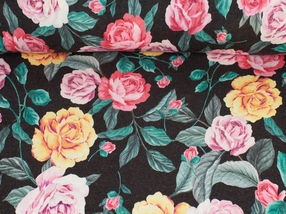 Vi presentiamo un tessuto di alta qualità, ideale per maglioni, abiti o tuniche. Il tessuto è sottile, molto piacevole al tatto e si drappeggia bene. Un bellissimo motivo floreale perfetto per abiti autunnali!