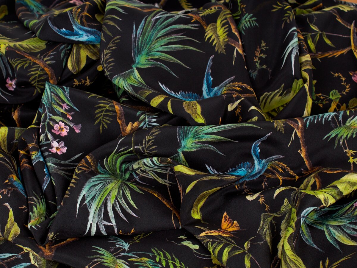 Viena skaista itāļu zīda auduma kolekcija, kas iedvesmota no modes nama Gucci. Zīds ir matēts, mīksts un plūstošs. Džungļu un eksotisko putnu raksts brīnišķīgās krāsās.