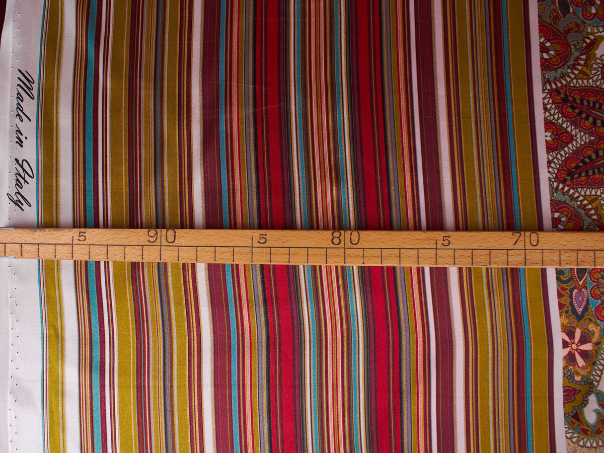 Apresentamos a seda satinada com padrão paisley e listras nas bordas. O tecido é leve, fluido e permite a passagem de ar. É perfeito para a confecção de roupas de primavera/verão.